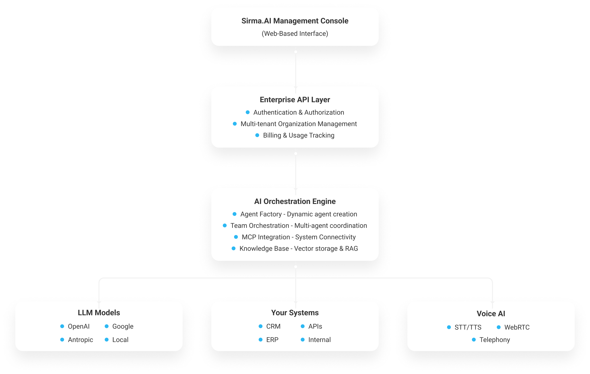 Un concept central in arhitectura Sirma este utilizarea sistemelor AI multi-agent. In locul unui model unic, sarcinile sunt distribuite intre agenti specializati.